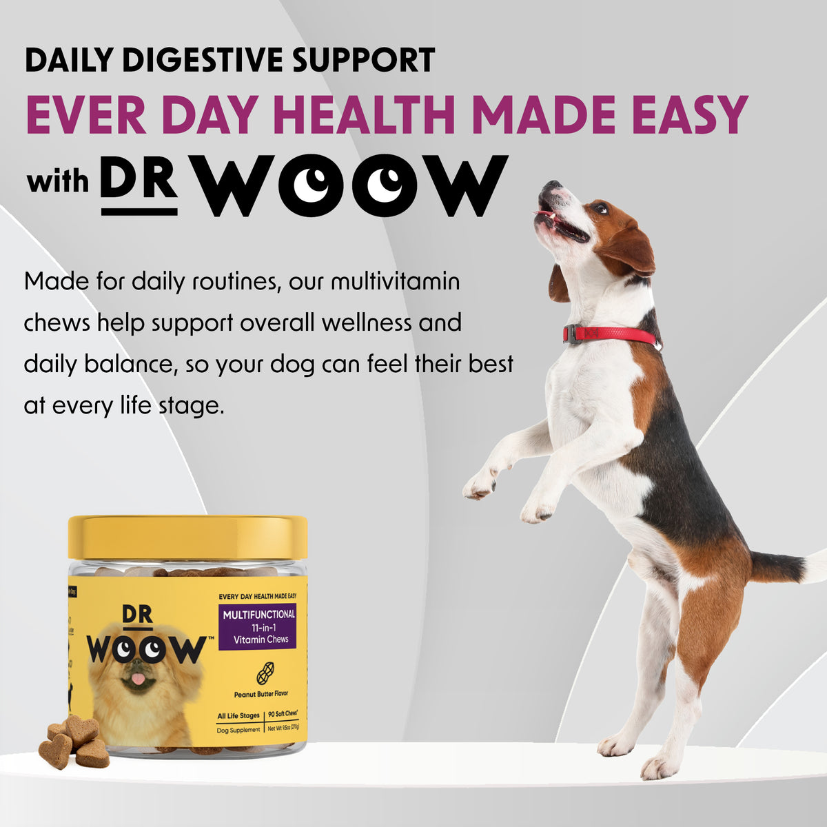 Dr Woow soft chews are formulated for all life stages, including puppies through senior dogs. We recommend starting from an early age because preventative nutrition is the key to long-term health.