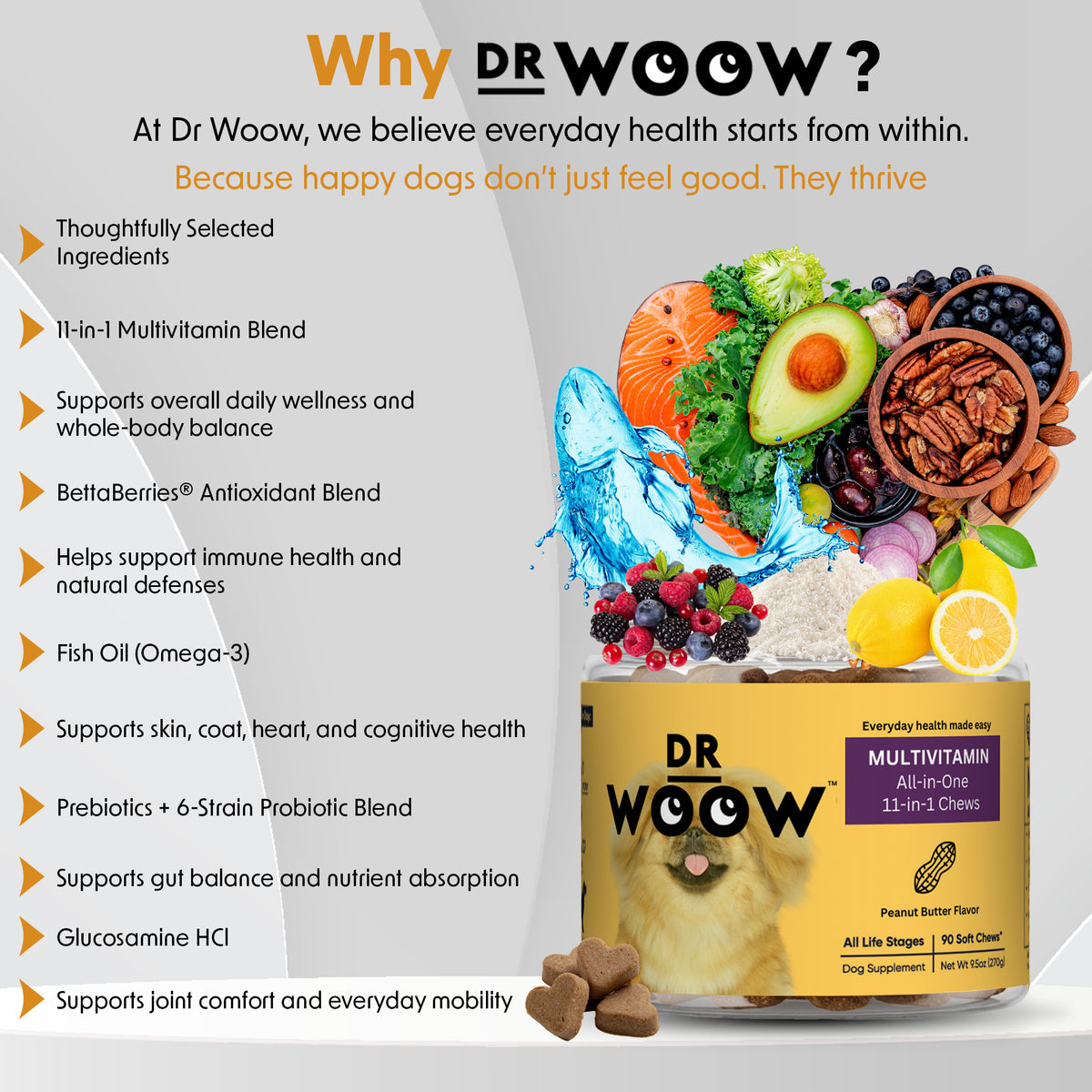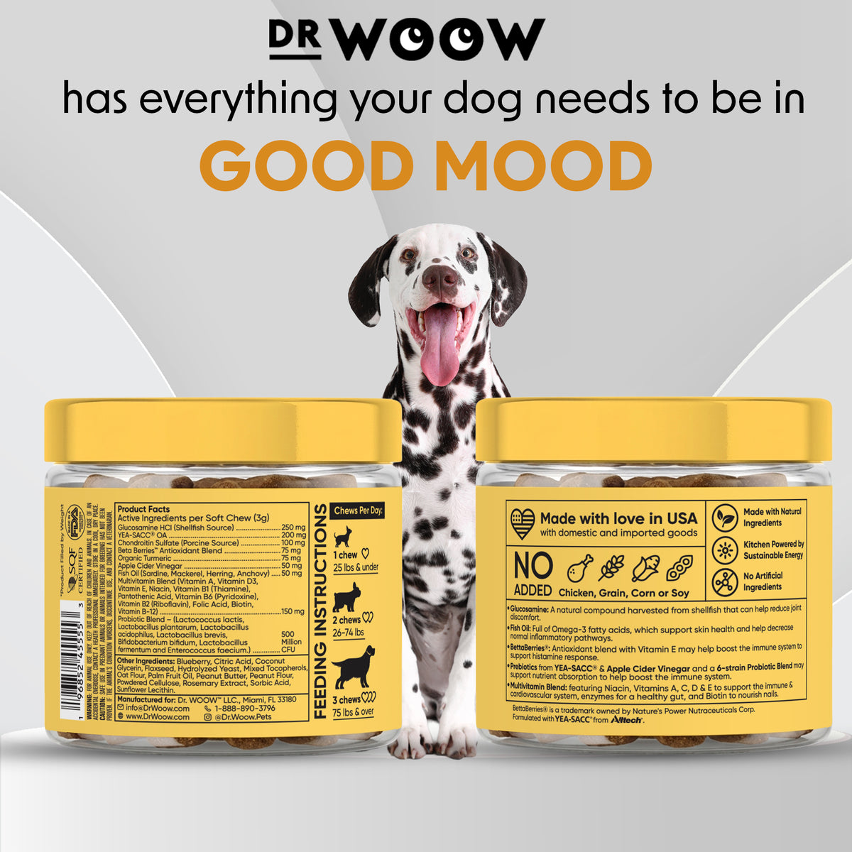 Dr Woow supplements were formulated by top pet nutritionists. We looked at breakthrough research to take each supplement to the next level of innovation. Each ingredient was carefully selected for a specific benefit it provides to the overall formulation. We also made sure to test the palatability of our soft chews so that all formulas taste like treats to dogs yet provide a high level of efficacy.